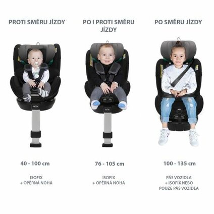 Od narodenia až do 19,5 kg chráni deti 5-bodový bezpečnostný pás s kvalitnou sponou Immi. V tejto fáze sa autosedačka púta pomocou isofixu a opornej nohy. Deti môžu jazdiť proti smeru jazdy až do 105 cm. Vďaka otáčaniu je možné od 76 cm zvoliť aj jazdu v smere. Až dieťa povyrastie, jednoducho prejdete na pútanie 3bodovým pásom vozidla. Oporná noha sa sklopí pod autosedačku. Vaše dieťa je perfektne chránené od narodenia až do 135 cm. - Pohodlná a bezpečná autosedačka