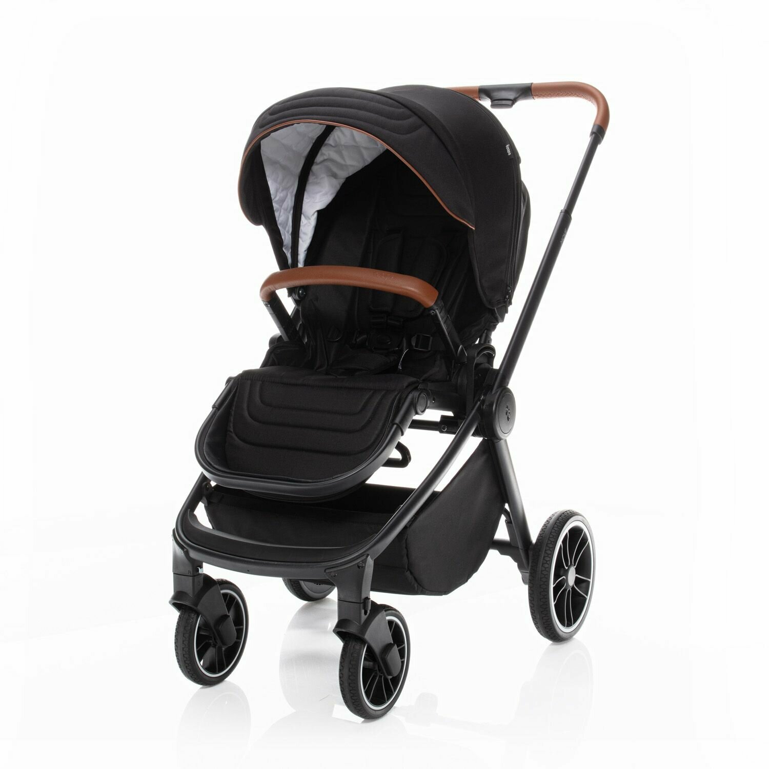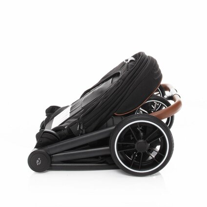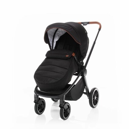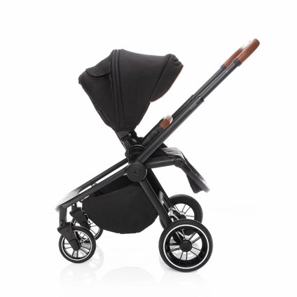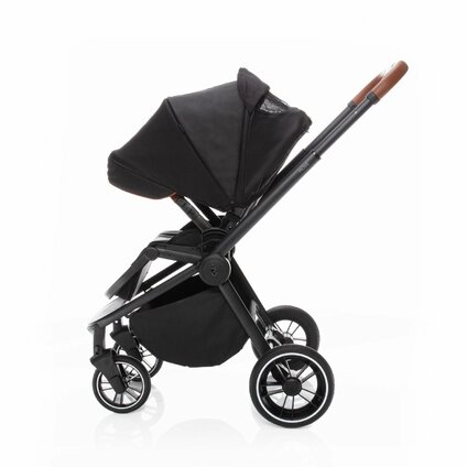 - Pokud jste vyššího vzrůstu, u kočárku jistě oceníte výškově nastavitelnou rukojeť, která je, stejně jako hrazda, vyrobena z eko-kůže. Což ještě více podtrhuje moderní vzhled kočárku. Pro snadnější manipulaci můžete hrazdu hbitě odepnout a odklonit na stranu. Tím si usnadníte vkládání dítěte do kočárku. Samozřejmostí je také bezpečné připoutání 5bodovým bezpečnostním pásem a pro zajištění kočárku samozřejmě nechybí ani centrální brzda.