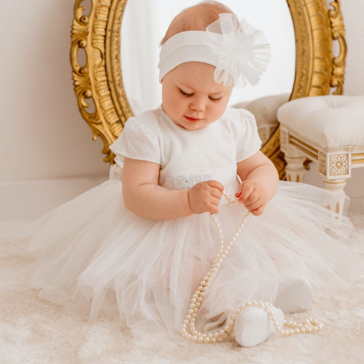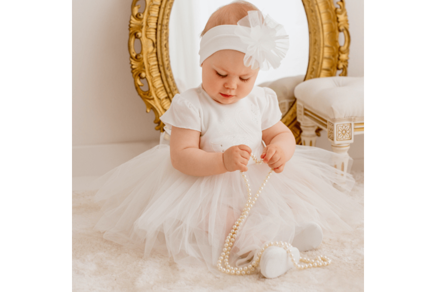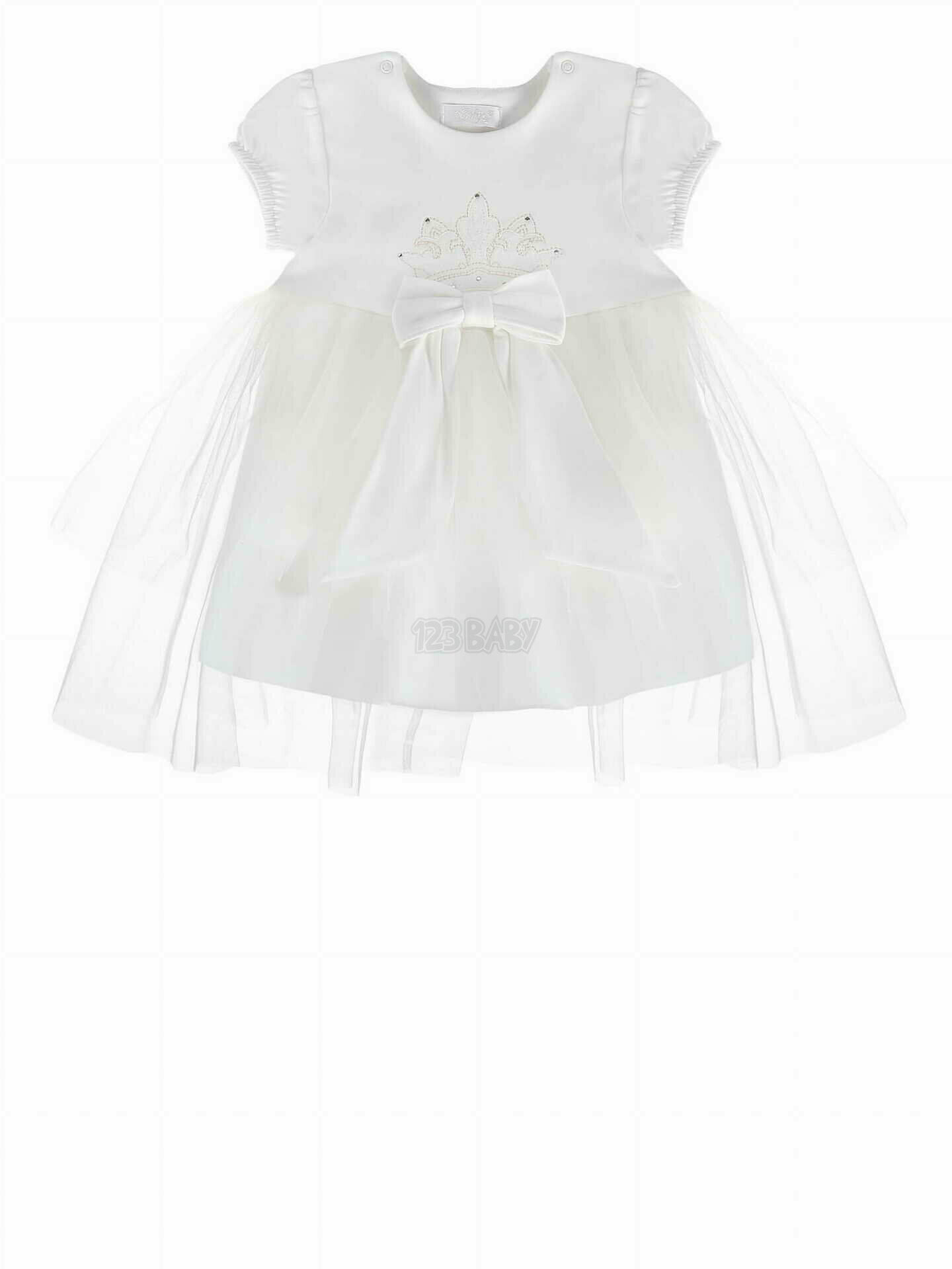 PopisKrásne bavlnené šaty pre dievčatko Farba: slonia kosť Krátky rukáv Vpredu ozdobná výšivka korunky Tylový volánik Zapínanie na patentky na ramene 100% bavlna Výrobca: SOFIJA